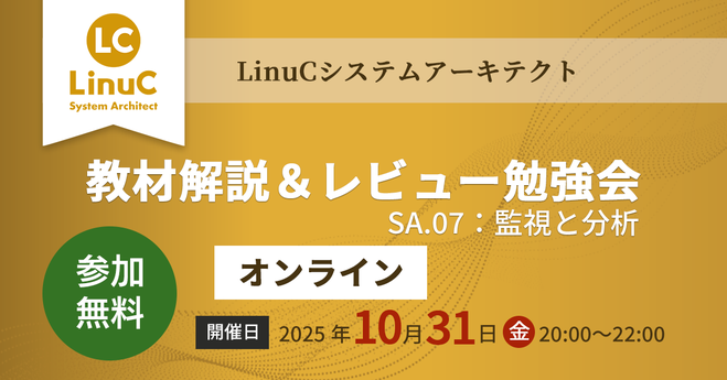 10月31日20時より、LinuC Open Network主催のオンラインイベントとして、「LinuCシステムアーキテクト教材解説&レビュー勉強会」を開催します。今回は、監視と分析をテーマとした、SA.07編です。
